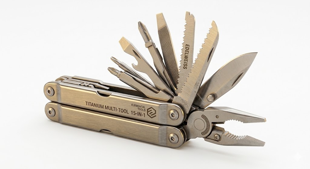 Premium titanium multi-tool with 15 functions. Lifetime warranty included.