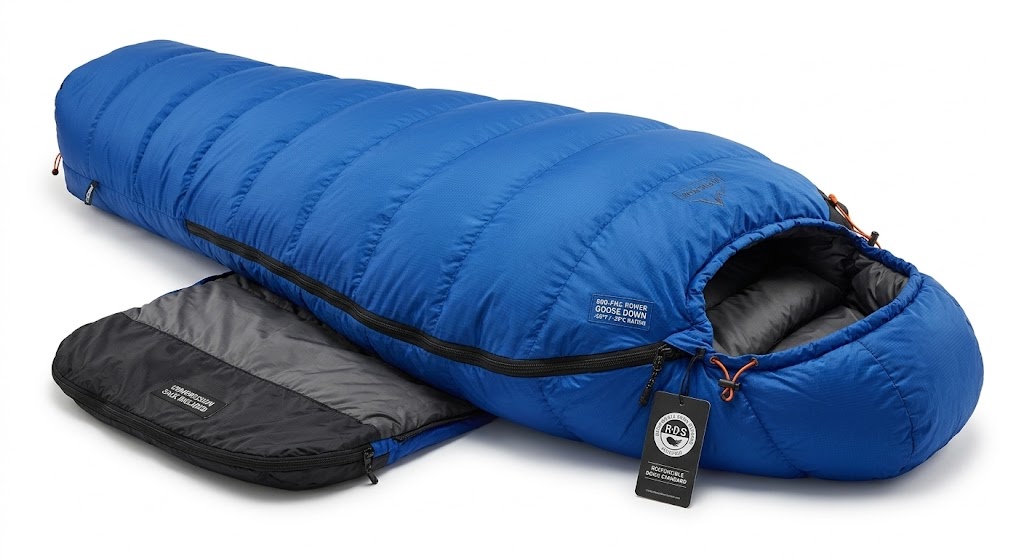 Premium down sleeping bag rated for extreme cold. Responsibly sourced down insulation.
